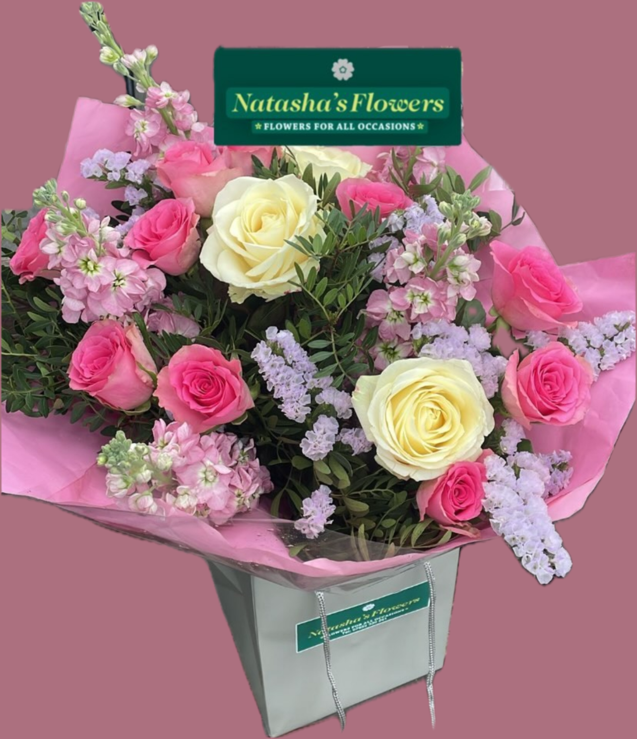 Indulge in the exquisite blend of white roses, lilac statice, pink stocks, and pink roses carefully arranged in a water, accompanied by a luxurious gift bag.