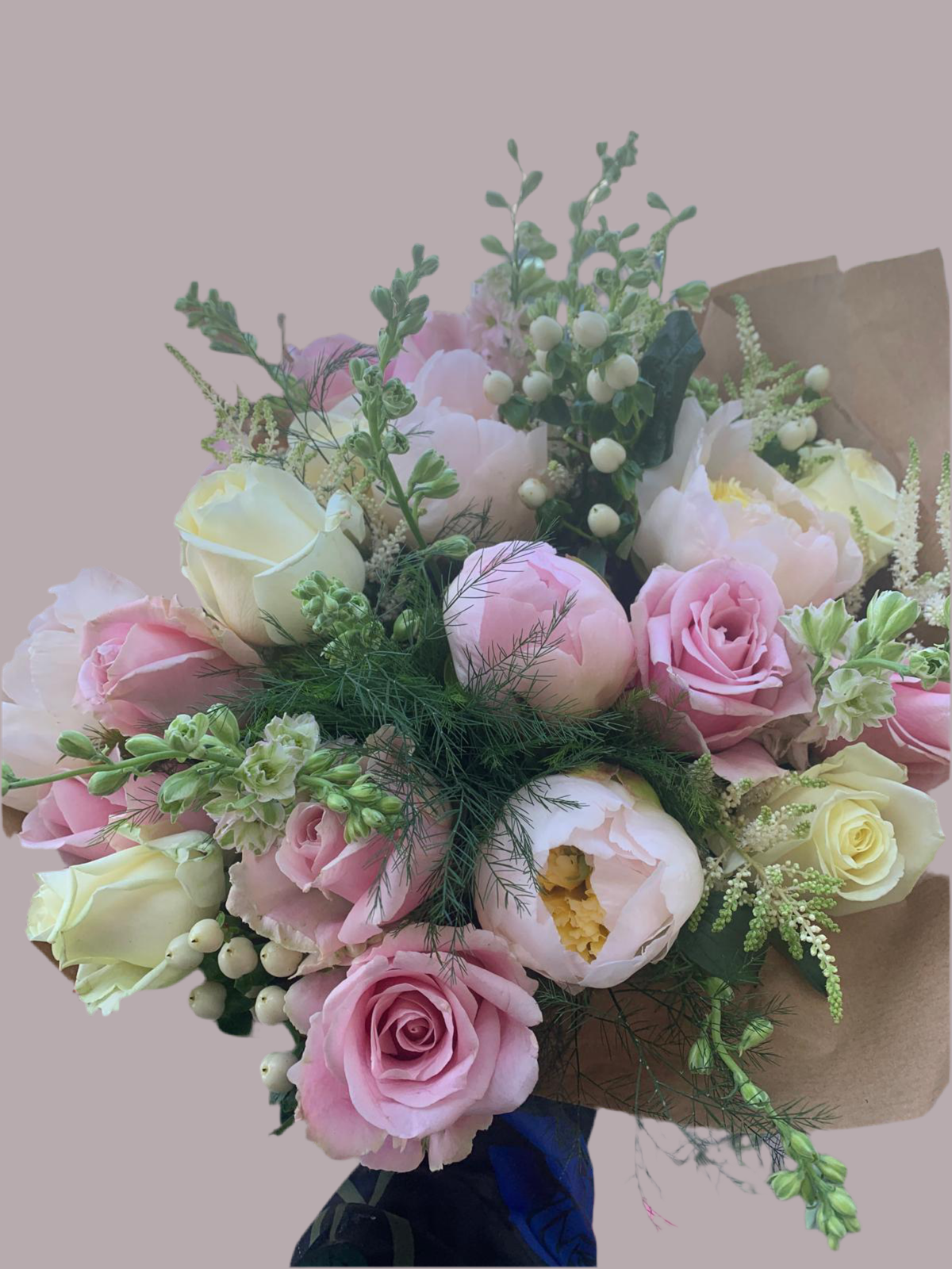 This delightful bouquet features delicious avalanche and pink roses, along with peonies, lisianthus, and hypericum berry, all presented in water with a gift bag.