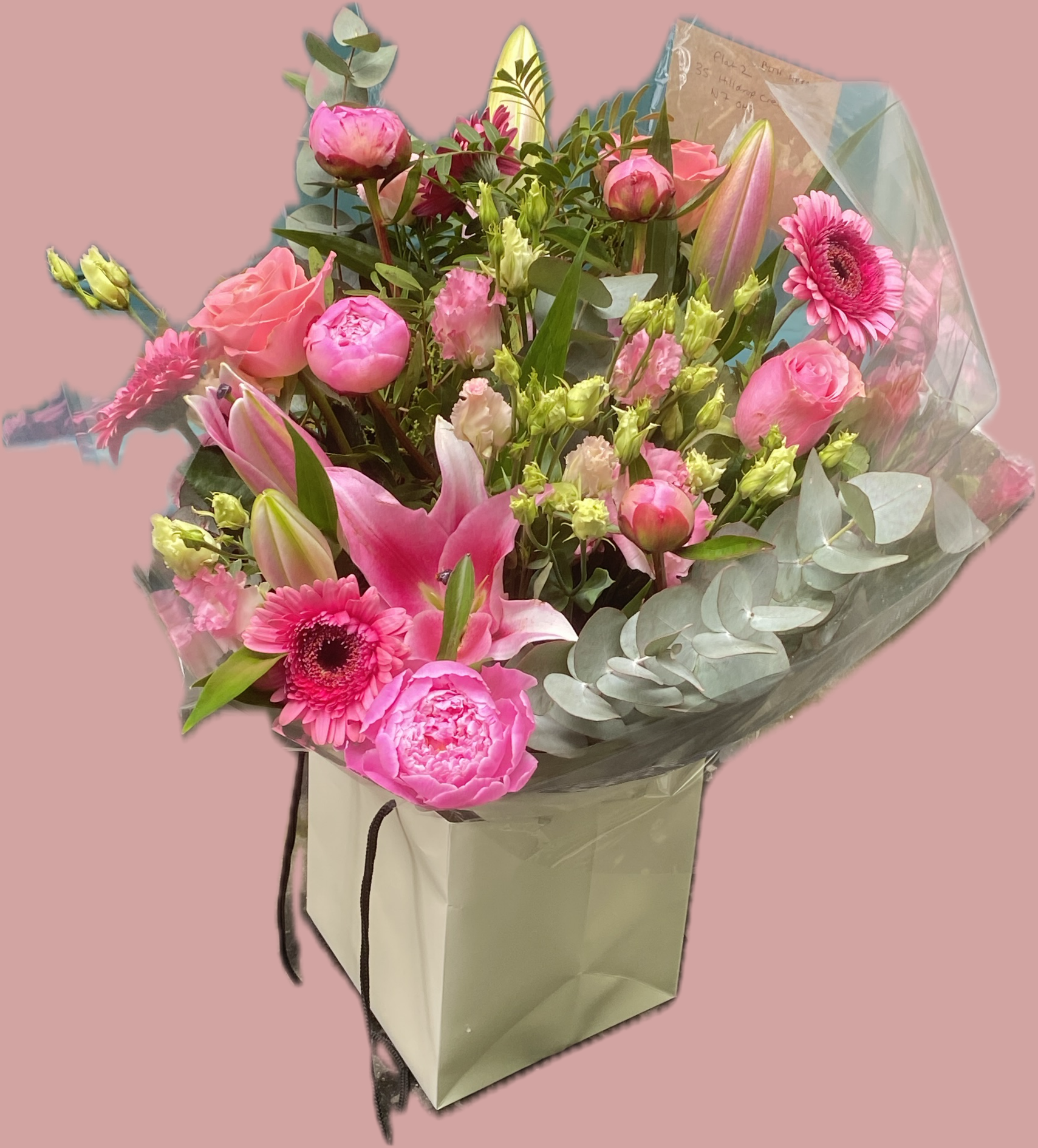A stunning fusion of pink lilies, peonies, and roses arranged in water with a complimentary gift bag.