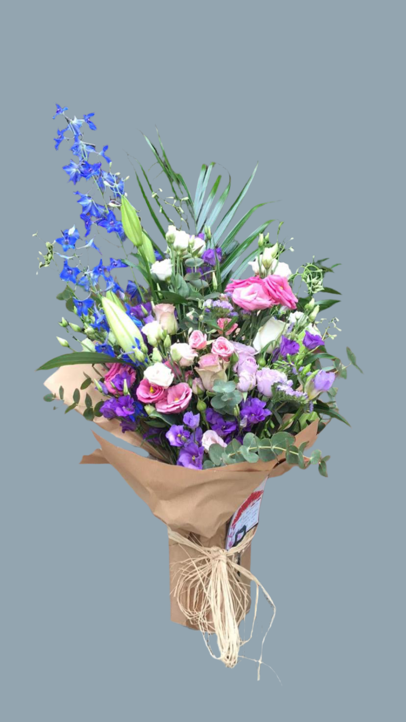 This bouquet features a beautiful mix of blue delphinium, purple and pink lilies, crysanthemums, and lisianthus, all arranged in a water and accompanied by a gift bag.