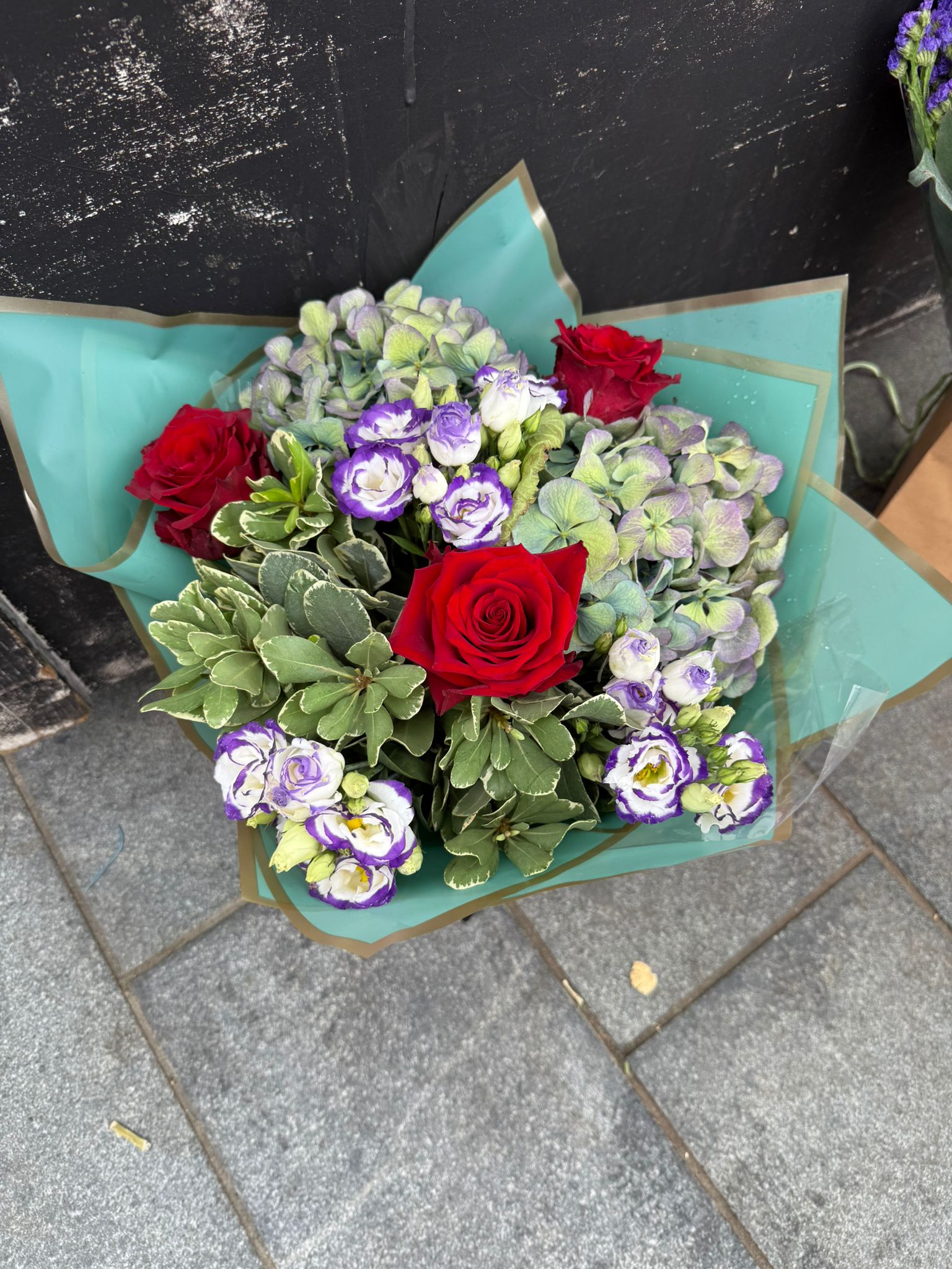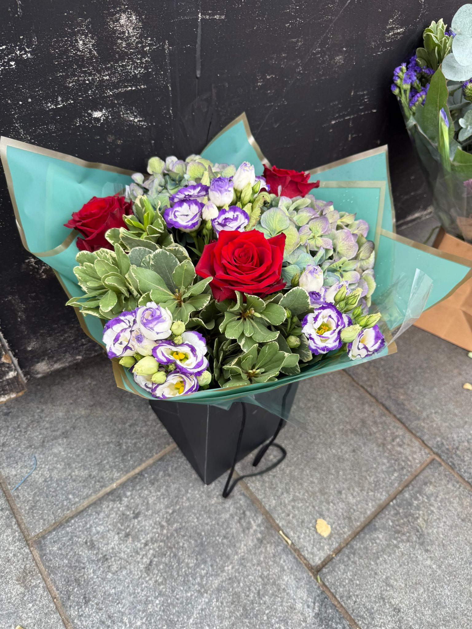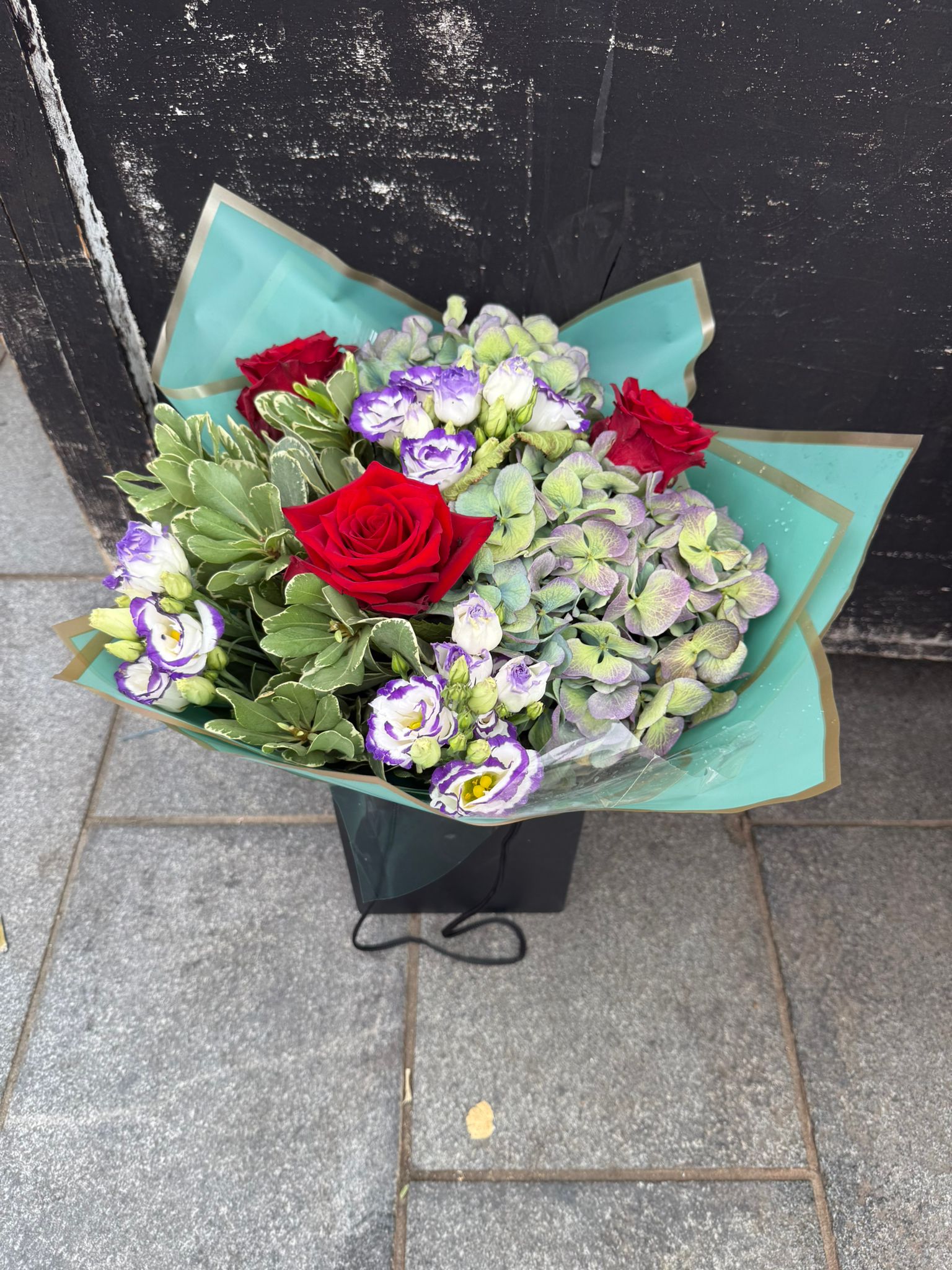 This arrangement features red roses, green hydrangeas, lysianthus, and lush greenery. Elegantly presented in a gift box, it offers a timeless and charming floral display.