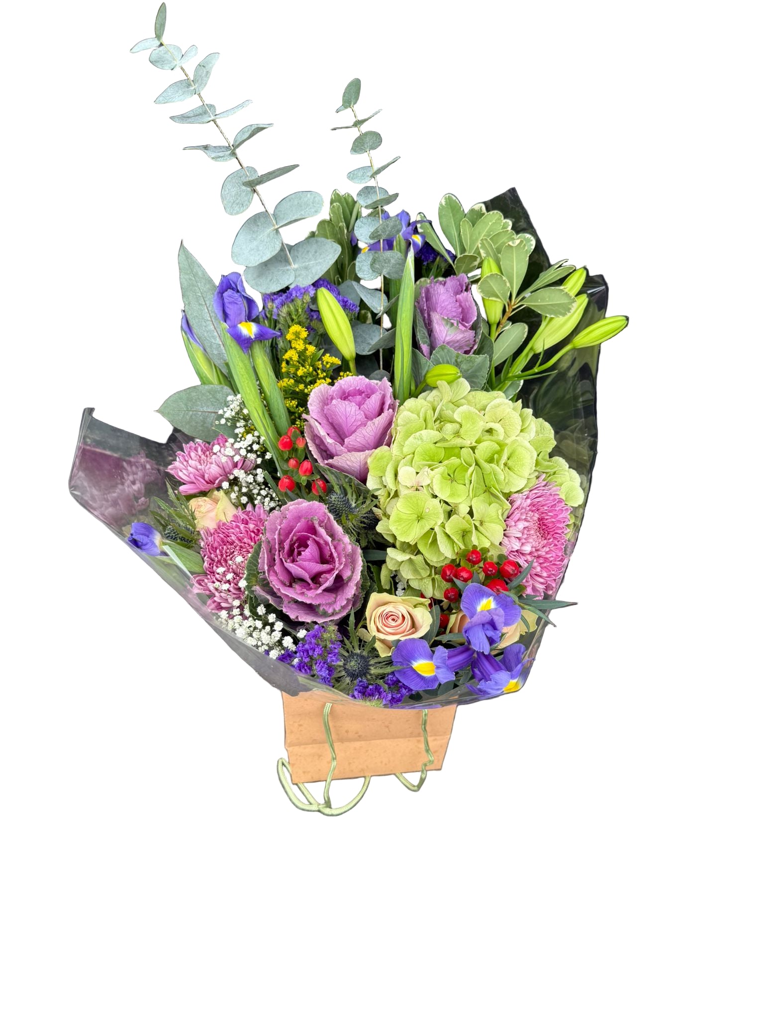 This elegant bouquet features stunning purple irises and roses, complemented by hydrangeas and lilies. It is presented in a stylish gift box for a refined and thoughtful gift.