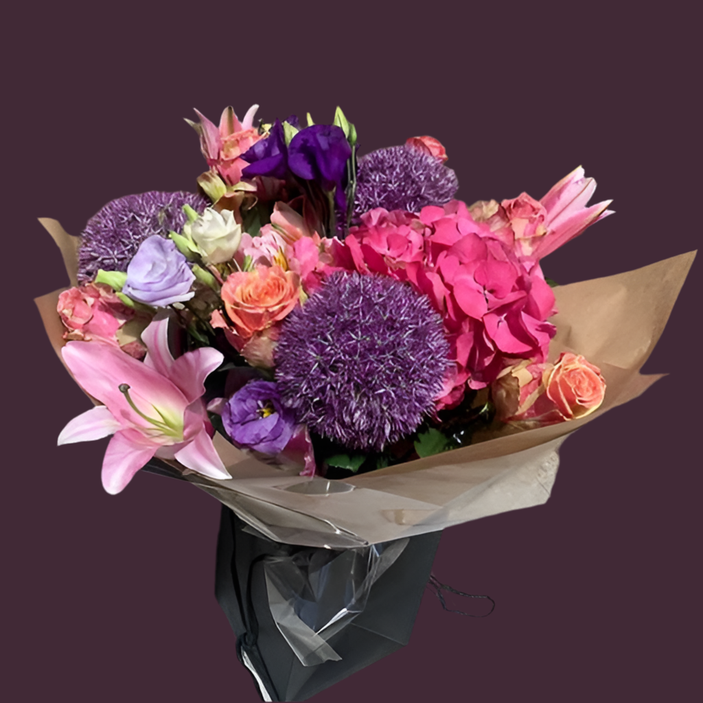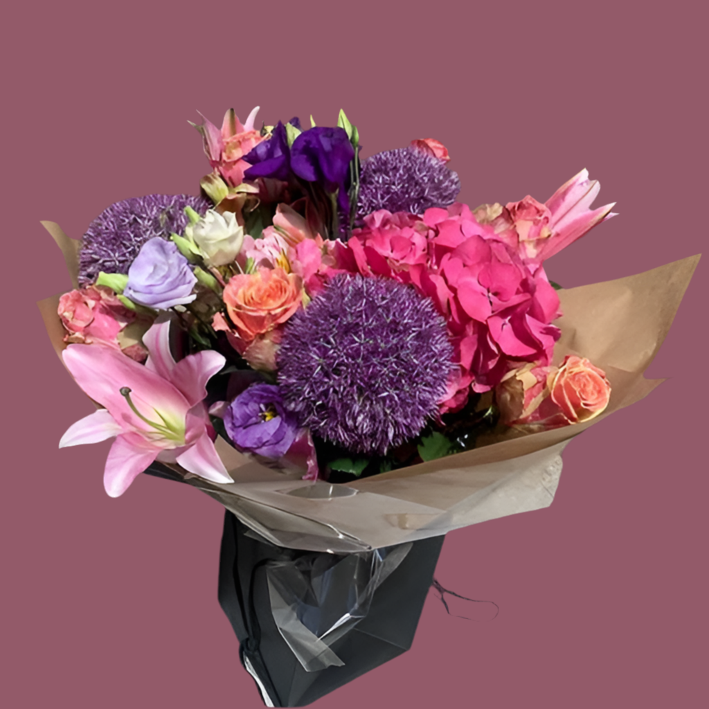 An exquisite combination of Hydrangeas, Allium, Lilies, and Lisianthus elegantly presented in a water with a charming gift bag.