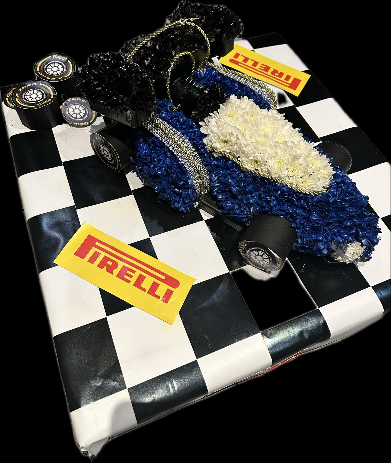 A stunning tribute to race cars featuring expertly arranged chrysanthemums and carefully placed vinyl accents. This customisable tribute is perfect for any race team. Simply specify your preferences at checkout or contact us directly for personalised assistance.