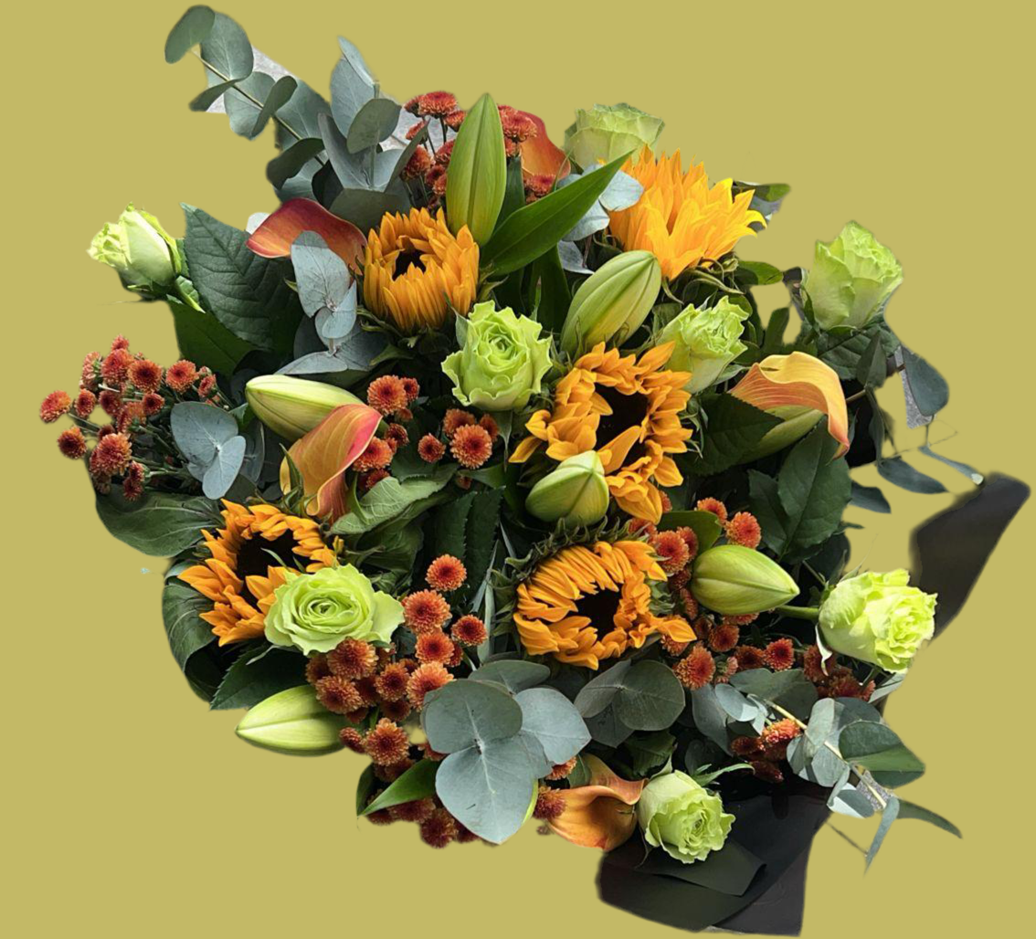 Welcome to Sun Lily! Our stunning arrangement features a delightful combination of sunflowers, lilies, and roses, as well as chrysanthemums, eucalyptus, and cala lilies, all beautifully presented in water and accompanied by a gift bag. Let us help you choose the perfect gift for any occasion.