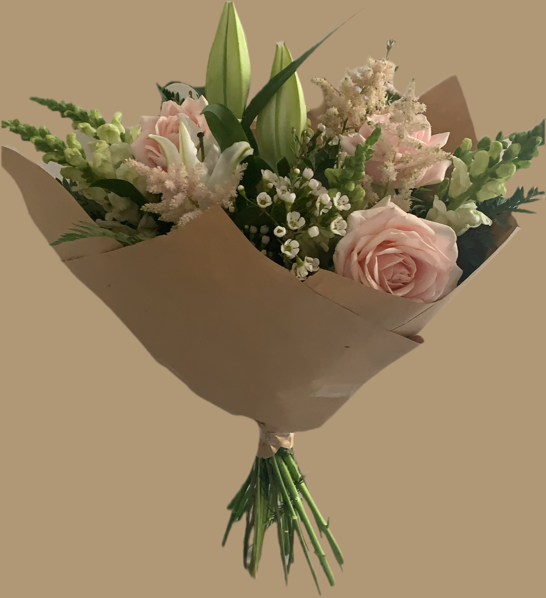 A bouquet of sweet avalanche Roses paired with seasonal eucalyptus foliages and Lilly blooms. Showcased in water with a gift bag.