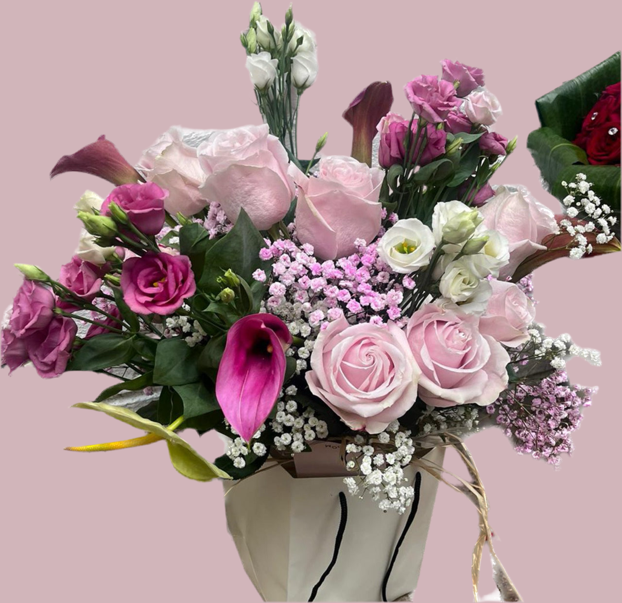 This stunning bouquet features sweet avalanche roses, calla lilies, and gypsophila, creating the perfect pink arrangement for those with a taste for boutique elegance